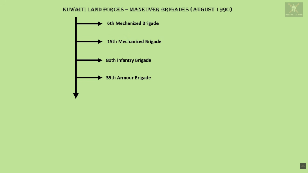 The Kuwait Land Forces were composed of four brigades, in addition to the Amiri Guard and the Commandos Battalion. The 6th Mechanized Brigade was positioned in the north and was equipped with M113 armored personnel carriers, BMP-2 infantry fighting vehicles, and Vickers tanks. South of Kuwait City, the 15th Mechanized Brigade was stationed with Chieftain tanks and M113s. The 80th Infantry Brigade was based in Jahra, consisting primarily of light infantry supported by a limited number of Saladin armored cars.