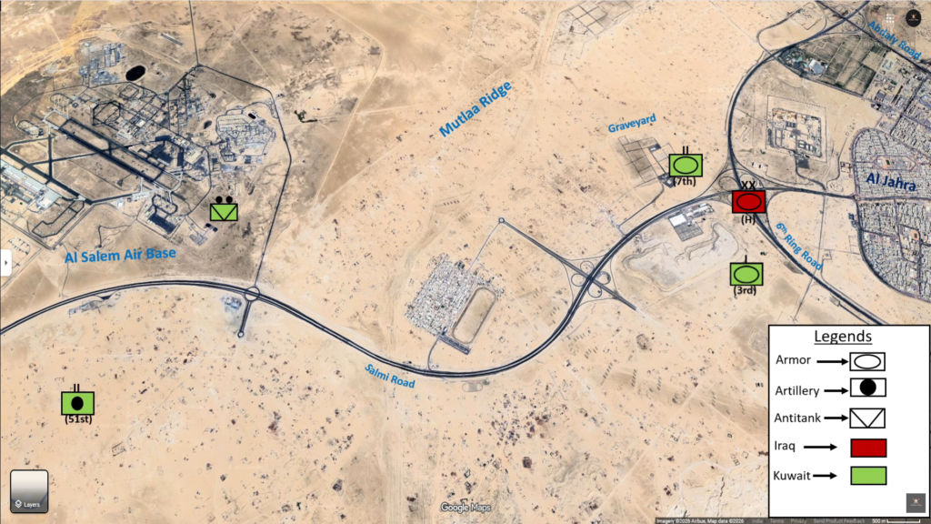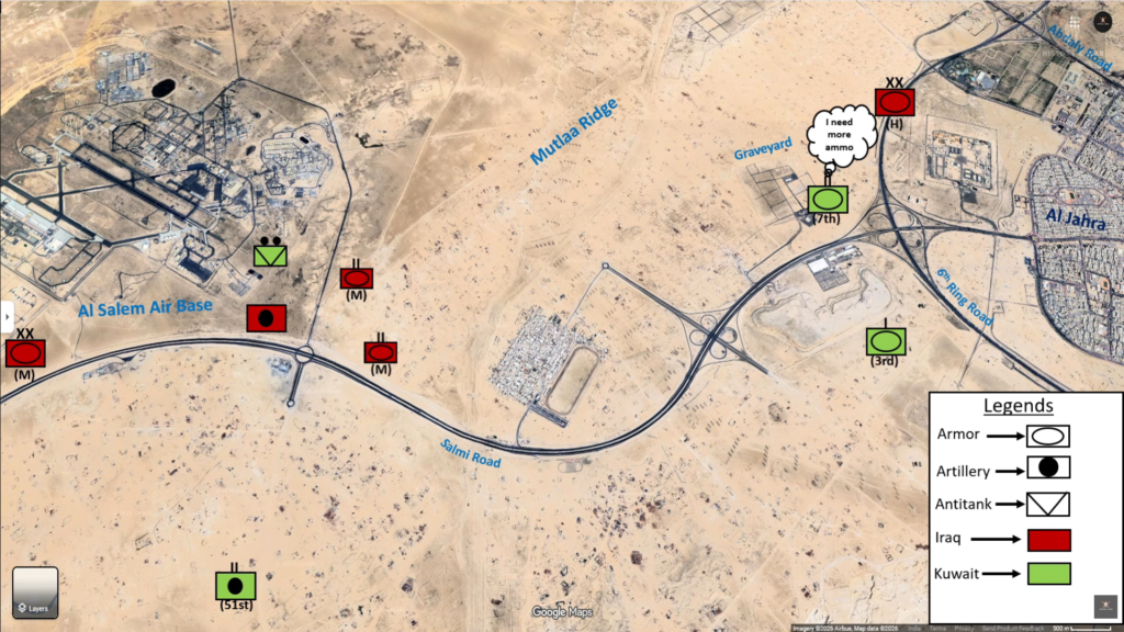 Colonel Salem left the camp at 4:30 AM and joined the antitank company, while the remaining units completed their preparations and cleared the camp by 6 AM, dispersing to avoid becoming a clear target for the Iraqis. The antitank company initially deployed in two sections. One section was sent to the Al Salem airbase for security, while the other secured the intersection of the 6th Ring Road and the Salmi Road. While moving east along the Salmi Road, they observed an Iraqi air raid on the Al Salem airbase. Meanwhile, the rest of the brigade’s forces began to assemble and depart the camp. The 7th Battalion assembled three companies, each with 9, 10, and 7 tanks, respectively, plus the battalion commander’s tank (which broke down during the movement east). The 3rd Company of the 8th Battalion had 10 tanks, the single company from the 57th Battalion had about five BMP-2 Infantry Fighting Vehicles along with several M113 armored personnel carriers, and a composite firing battery from the 51st Artillery Battalion had seven guns.